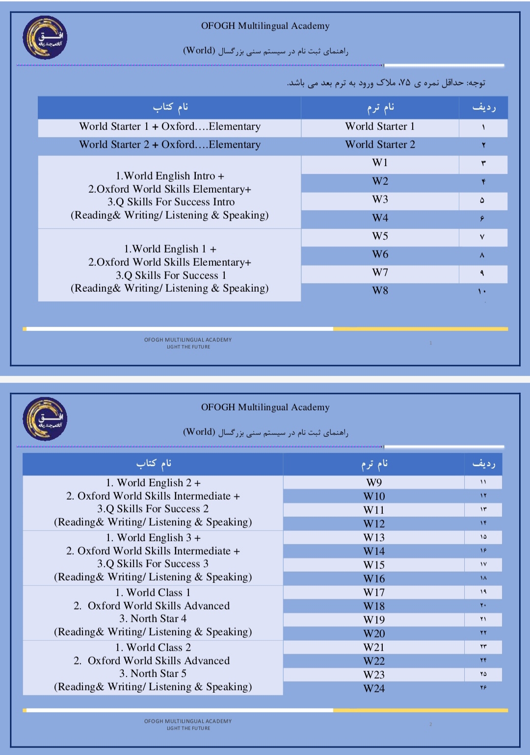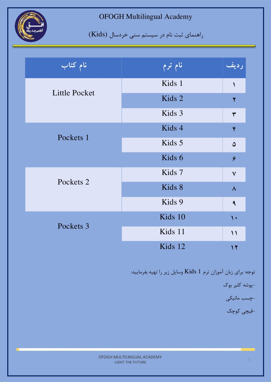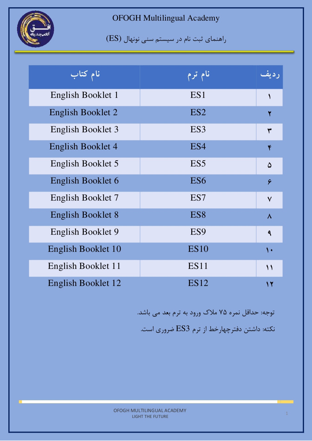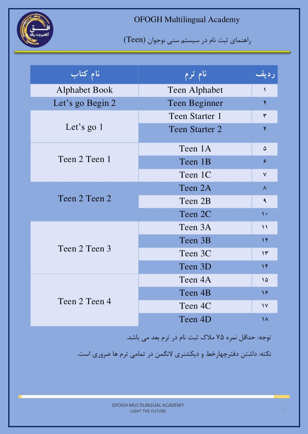 راهنمای ثبت نام راهنمای فعال سازی اعلان های سایت در اپلیکیشن (بله ) راهنمای ورود به پنل کاربری راهنمای نحوه اطلاع از ساعت کلاسی فیلم آموزشی ثبت نام در کلاس های ترم جدید راهنمای ثبت نام در سیستم خردسال راهنمای ثبت نام در سیستم نونهال راهنمای ثبت نام در سیستم نوجوان راهنمای ثبت نام در سیستم بزرگسال